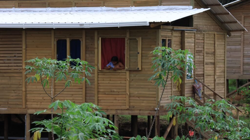 Cada vivienda tiene 60 metros cuadrados de área construida y responde a las condiciones climáticas de la Amazonía. Las casas se levantaron en madera sobre pilotes y cuentan con paneles estructurales y cubiertas termoacústicas.