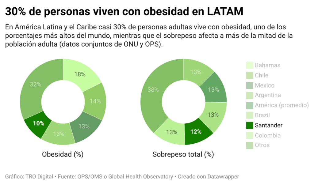 La situación en Santander refleja una tendencia nacional. Datos comparables de la Organización Panamericana de la Salud indican que cerca de una cuarta parte de los adultos colombianos viven con obesidad.